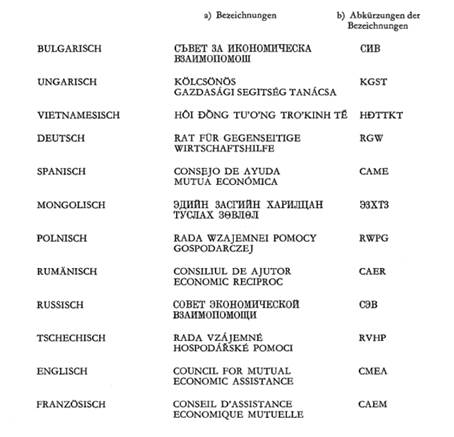 Anlage Abkürzungen, Bezeichnungen und Emblem des Rates für gegenseitige Wirtschaftshilfe