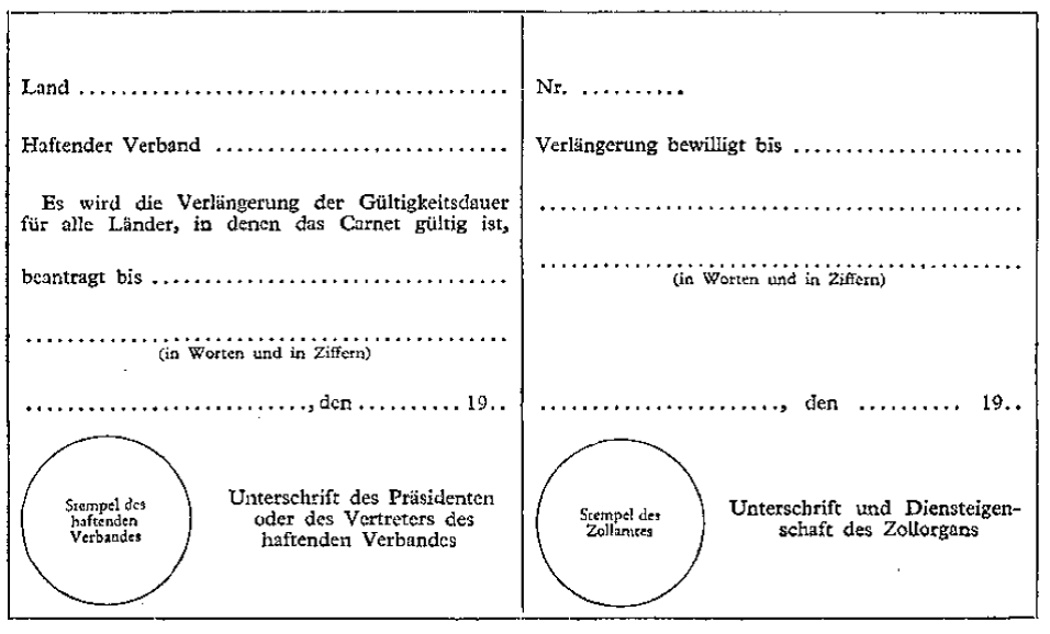 - b) Ist der haftende Verband der Ansicht, daß der Verlängerungsantrag der Zollbehörde zur Genehmigung zugeleitet werden kann, so bringt er den in Absatz 1 erwähnten Stempelaufdruck in dem auf dem Umschlagblatt des Carnet dafür vorgesehenen Platz an.