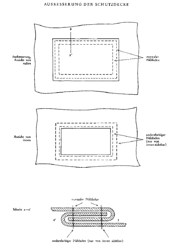 5. 5. Ausbesserungen sind nach dem in der Zeichnung 4 beschriebenen Verfahren vorzunehmen; die Ränder müssen ineinandergefaltet und durch zwei sichtbare, mindestens 15 mm voneinander entfernte Nähte miteinander verbunden sein. Die Farbe des auf der Innenseite sichtbaren Fadens muß sich von der Farbe des auf der Außenseite sichtbaren Fadens und von der Farbe der Schutzdecke unterscheiden; alle Nähte müssen mit der Maschine genäht sein. Ausbesserungen von Schutzdecken aus kunststoffbeschichtetem Gewebe können auch nach dem in Absatz 4 beschriebenen Verfahren vorgenommen werden.