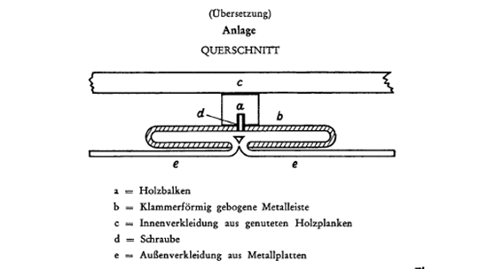 2. oder durch Metalleisten verbunden werden, die unter Druck gleichzeitig mit den zu verbindenden Elementen klammerförmig gebogen worden sind und auf diese Weise eine dauerhafte Verbindung der gebogenen Ränder gewährleisten (siehe Zeichnung in der Anlage).