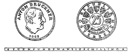 Die Münzen sind aus einer Legierung von 800 Tausendteilen Silber und 200 Tausendteilen Kupfer hergestellt; sie haben einen Durchmesser von 30 mm und ein Rauhgewicht von 13 g, enthalten somit 10'4 g Feinsilber. Abweichungen hievon dürfen im Feingehalt 5/1000 und im Gewicht 10/1000 nicht übersteigen. Die eine Seite zeigt das Kopfbild des Komponisten Anton Bruckner in rechter Seitenansicht, umgeben von der halbkreisförmigen Umschrift „Anton Bruckner“; ferner das Ausgabejahr „1962“. Die andere Seite zeigt in der Mitte die Ziffer „25“, darunter zwei Lorbeerzweige und das Wort „Schilling“, umgeben von den Wappen der neun Bundesländer und der Umschrift „Republik Österreich“. Die innere Einfassung besteht auf beiden Seiten aus einem flachen Stäbchen. Der Rand der Münze ist glatt und trägt die vertiefte Inschrift „Fuenfundzwanzig Schilling“.