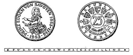 Die Münzen sind aus einer Legierung von 800 Tausendteilen Silber und 200 Tausendteilen Kupfer hergestellt; sie haben einen Durchmesser von 30 mm und ein Rauhgewicht von 13 g, enthalten somit 10'4 g Feinsilber. Abweichungen hievon dürfen im Feingehalt 5/1000 und im Gewicht 10/1000 nicht übersteigen. Die eine Seite zeigt das Brustbild des Prinzen Eugen von Savoyen in Ritterrüstung nach einer zeitgenössischen Abbildung, umgeben von der kreisförmigen Umschrift „Prinz Eugen von Savoyen“ und den Jahreszahlen „1663 - 1736 - 1963“. Die andere Seite zeigt in der Mitte die Zahl „25“, darunter zwei Lorbeerzweige und das Wort „Schilling“, umgeben von den Wappen der neun Bundesländer und der Umschrift „Republik Österreich“. Die innere Einfassung besteht auf beiden Seiten aus einem flachen Stäbchen. Der Rand der Münze ist glatt und trägt die vertiefte Inschrift „Fuenfundzwanzig Schilling“.