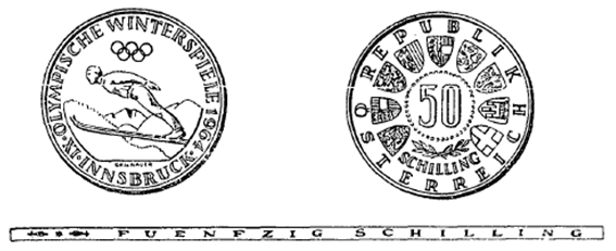 Die Münzen sind aus einer Legierung von 900 Tausendteilen Silber und 100 Tausendteilen Kupfer hergestellt; sie haben einen Durchmesser von 34 mm und ein Rauhgewicht von 20 g, enthalten somit 18 g Feinsilber. Abweichungen hievon dürfen im Feingehalt 5/1000 und im Gewicht 10/1000 nicht übersteigen. Die eine Seite zeigt einen Skispringer vor einer Gebirgslandschaft sowie die fünf olympischen Ringe und die Umschrift „IX. Olympische Winterspiele 1964 Innsbruck“. Die andere Seite zeigt in der Mitte die Zahl „50“, darunter zwei Lorbeerzweige und das Wort „Schilling“, umgeben von den Wappen der neun Bundesländer und der Umschrift „Republik Österreich“. Beide Seiten der Münze sind von einer erhöhten Randleiste umrahmt. Der Rand der Münze ist glatt und trägt die vertiefte Inschrift „Fuenfzig Schilling“.