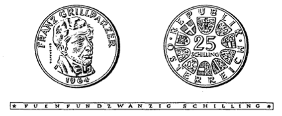 Die Münzen sind aus einer Legierung von 800 Tausendteilen Silber und 200 Tausendteilen Kupfer hergestellt; sie haben einen Durchmesser von 30 mm und ein Rauhgewicht von 13 g, enthalten somit 10'4 g Feinsilber. Abweichungen hievon dürfen im Feingehalt 5/1000 und im Gewicht 10/1000 nicht übersteigen. Die eine Seite zeigt das Kopfbild des Dichters Franz Grillparzer im Dreiviertel-Profil, umgeben von der halbkreisförmigen Umschrift „Franz Grillparzer“, sowie das Ausgabejahr „1964“. Die andere Seite zeigt in der Mitte die Zahl „25“, darunter das Wort „Schilling“, ferner in kreisförmiger Reihung das Bundeswappen und die Wappen der neun Bundesländer sowie die Umschrift „Republik Österreich“. Beide Seiten der Münze sind von einer erhöhten Randleiste umrahmt. Der Rand der Münze ist glatt und trägt die vertiefte Inschrift „Fuenfundzwanzig Schilling“.