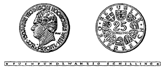 Die eine Seite der Münze hat das Kopfbild des Gründers der Technischen Hochschule Wien in rechter Seitenansicht, kreisförmig umgeben von den Umschriften „150 Jahre Technische Hochschule Wien“ und „J. J. R. v. Prechtl“, sowie die Jahreszahl „1965“ zu zeigen. Die andere Seite hat in der Mitte die Zahl „25“, darunter das Wort „Schilling“, ferner in kreisförmiger Reihung das Bundeswappen und die Wappen der neun Bundesländer sowie die Umschrift „Republik Österreich“ zu zeigen. Beide Seiten sind mit einer erhöhten Randleiste zu umrahmen. Der Rand der Münze ist glatt zu gestalten und hat die vertiefte Inschrift „Fuenfundzwanzig Schilling“ zu tragen.