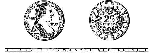 Die eine Seite der Münze hat das Brustbild der Kaiserin samt Umschrift zu zeigen, das dem auf dem Maria Theresientaler befindlichen gleicht. Die Umschrift lautet: „M.THERESIA.D.G.R.IMP. HU.BO.REG.“. Links und rechts des Brustbildes befinden sich die Jahreszahlen „1717“ und „1780“, darunter die Jahreszahl „1967“. Die andere Seite der Münze hat in der Mitte die Zahl „25“, darunter das Wort „Schilling“, ferner in kreisförmiger Reihung das Bundeswappen und die Wappen der neun Bundesländer sowie die Umschrift „Republik Österreich“ zu zeigen. Beide Seiten sind mit einer erhöhten Randleiste zu umrahmen. Der Rand der Münze ist glatt zu gestalten und hat die vertiefte Inschrift „Fuenfundzwanzig Schilling“ zu tragen.