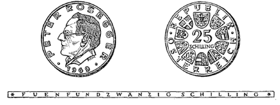 Die eine Seite der Münze hat das Kopfbild des Heimatdichters Peter Rosegger in Seitenansicht, umgeben von der Umschrift „Peter Rosegger“ und die Jahreszahl „1969“ zu zeigen. Die andere Seite der Münze hat in der Mitte die Zahl „25“, darunter das Wort „Schilling“, ferner in kreisförmiger Reihung das Bundeswappen und die Wappen der neun Bundesländer sowie die Umschrift „Republik Österreich“ zu zeigen. Beide Seiten sind mit einer erhöhten Randleiste zu umrahmen. Der Rand der Münze ist glatt zu gestalten und hat die vertiefte Inschrift „Fuenfundzwanzig Schilling“ zu tragen.