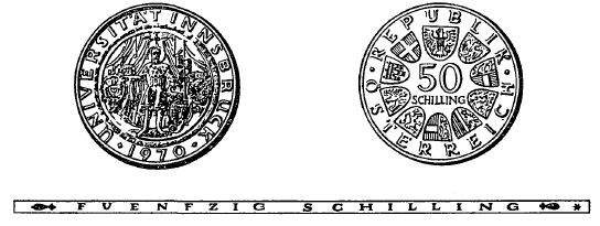 Die andere Seite hat in der Mitte die Zahl „50“, darunter das Wort „Schilling“, ferner in kreisförmiger Reihung das Bundeswappen und die Wappen der neun Bundesländer sowie die Umschrift „Republik Österreich“ zu zeigen. Beide Seiten sind mit einer erhöhten Randleiste zu umrahmen. Der Rand der Münze ist glatt zu gestalten und hat die vertiefte Inschrift „Fuenfzig Schilling“ zu tragen.