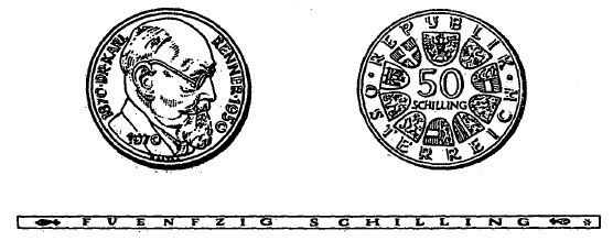 Die andere Seite hat in der Mitte die Zahl „50“, darunter das Wort „Schilling“, ferner in kreisförmiger Reihung das Bundeswappen und die Wappen der neun Bundesländer sowie die Umschrift „Republik Österreich“ zu zeigen. Beide Seiten sind mit einer erhöhten Randleiste zu umrahmen. Der Rand der Münze ist glatt zu gestalten und hat die vertiefte Inschrift „Fuenfzig Schilling“ zu tragen.