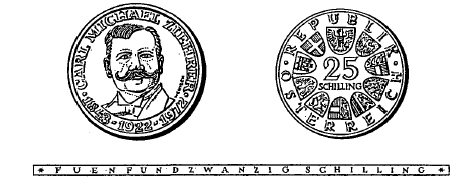 (1) Die eine Seite der Münze hat das Kopfbild von Carl Michael Ziehrer, umgeben von der Umschrift „Carl Michael Ziehrer“ und den Jahreszahlen „1843-1922-1972“ zu zeigen.