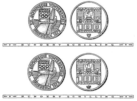 (1) Die eine Seite hat die Randinschrift „XII. Olympische Winterspiele Innsbruck 1976“ und die Abbildung einer stilisierten Sprungschanze mit der Bezeichnung „Bergisel Schanze“ sowie die Olympischen Ringe zu tragen.