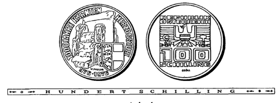 (2) Die andere Seite hat in quadratischer Anordnung die Worte „Republik Österreich“, darunter das Bundeswappen, die Zahl „100“ und das Wort „Schilling“ zu tragen.