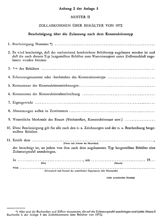 (14) Wird ein Behältertyp zugelassen, so wird dem Antragsteller ein einziges Verschlußanerkenntnis (Zulassungsbescheinigung) nach dem in Anhang 2 dieser Anlage abgedruckten Muster II erteilt, das für sämtliche nach der Beschreibung des zugelassenen Typs hergestellte Behälter gilt. Dieses Verschlußanerkenntnis (Zulassungsbescheinigung) berechtigt den Hersteller, an jedem Behälter der Serie des Typs eine Zulassungstafel nach Absatz 5 anzubringen. Besondere Bestimmungen für die Zulassung auf einer späteren Stufe als der der Herstellung