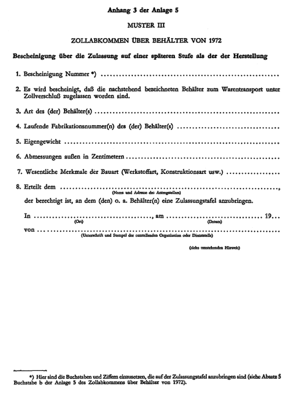 (17) Die zuständige Behörde prüft die nach ihrem Ermessen nötige Zahl von Behältern und stellt, nachdem sie sich davon überzeugt hat, daß die Behälter den technischen Bedingungen der Anlage 4 entsprechen, ein Verschlußanerkenntnis (Zulassungsbescheinigung) nach dem in Anhang 3 dieser Anlage abgedruckten Muster III aus, das nur für die Zahl der zugelassenen Behälter gilt. Dieses Verschlußanerkenntnis (Zulassungsbescheinigung), in dem die laufende Fabrikationsnummer der Behälter, für die es gilt, anzugeben ist, berechtigt den Antragsteller, an jedem so zugelassenen Behälter die Zulassungstafel nach Absatz 5 anzubringen.