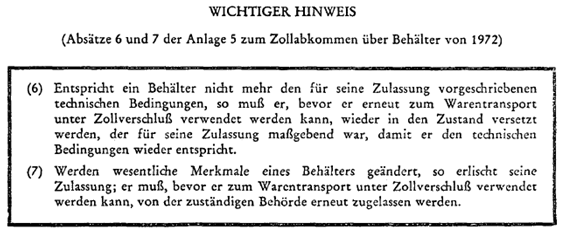 (7) Werden wesentliche Merkmale eines Behälters geändert, so erlischt seine Zulassung; er muß, bevor er zum Warentransport unter Zollverschluß verwendet werden kann, von der zuständigen Behörde erneut zugelassen werden.