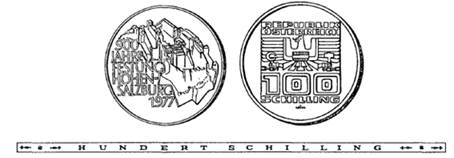 (2) Die andere Seie hat in quadratischer Anordnung die Worte „Republik Österreich“, darunter das Bundeswappen, die Zahl „100“ und das Wort „Schilling“ zu tragen.
