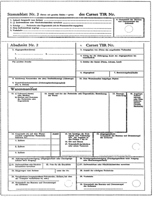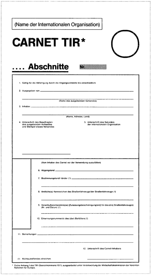 - 6. Zahl der Abschnitte: Wird der Transport nur über ein Abgangszollamt und ein Bestimmungszollamt durchgeführt, so muß das Carnet TIR mindestens zwei Abschnitte für das Abgangsland, zwei Abschnitte für das Bestimmungsland und zwei Abschnitte für jedes Durchgangsland enthalten, Für jedes zusätzliche Abgangszollamt (oder Bestimmungszollamt) sind zwei weitere Abschnitte erforderlich.