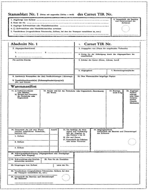 - 7. Vorlage bei den Zollstellen: Das Carnet TIR ist bei der Vorführung des Straßenfahrzeugs, des Lastzugs, des Behälters oder der Behälter bei jeder Abgangs-, Durchgangs- und Bestimmungszollstelle vorzulegen. Bei der letzten Abgangszollstelle ist die Unterschrift des Zollbeamten und der Datumsstempel der Zollstelle unter dem Warenmanifest im Feld 17 aller für den weiteren Transport zu verwendenden Abschnitte anzubringen.