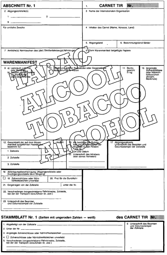 - 3. Für die Beförderung von Tabakwaren und Alkohol, für die vom bürgenden Verband nach Anlage 6, Erläuterung 0.8.3 eine erhöhte Sicherheitsleistung verlangt werden kann, fordern die Zollbehörden Carnets TIR mit gut lesbarem Aufdruck „TOBACCO/ALCOHOL“ und „TABAC/ALCOOL“ auf dem Umschlagblatt und allen weiteren Blättern. Zusätzlich sind auf einem gesonderten Blatt, das nach Seite 2 des Carnet-TIR-Umschlagblatts einzufügen ist, zu den Tabak- und Branntweinerzeugnissen, für die die Sicherheit geleistet wurde, nähere Angaben – zumindest in englischer und französischer Sprache – zu machen.