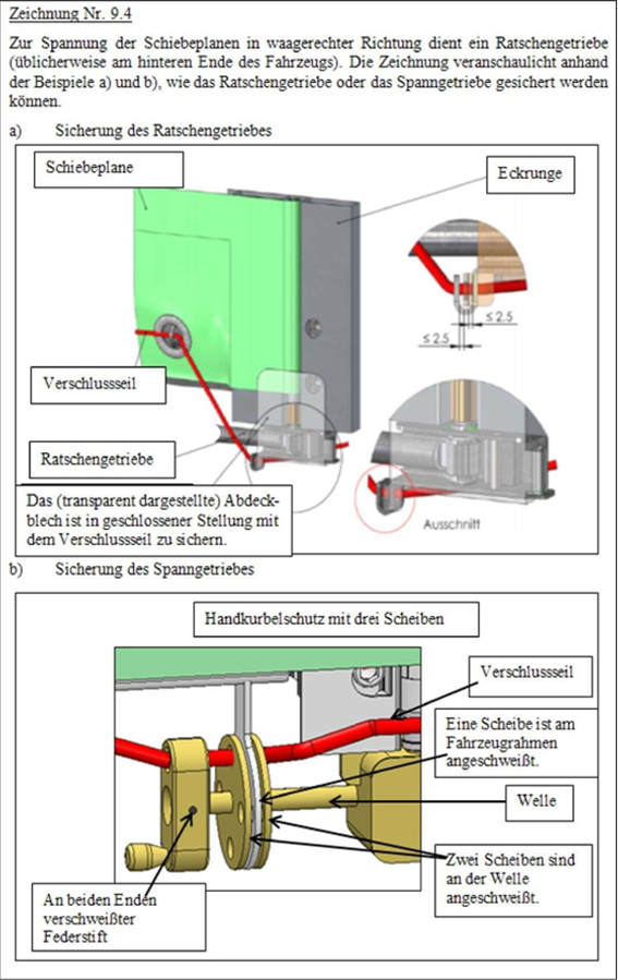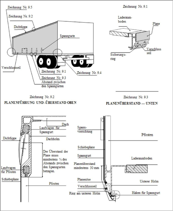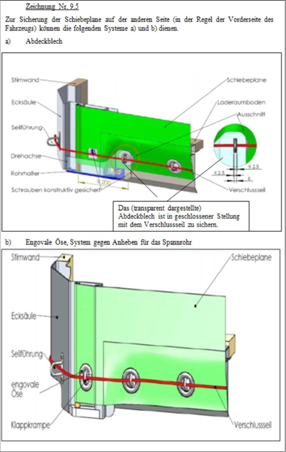 - iii) Die Führung der Schiebeplane, die Schiebeplanenspannvorrichtungen und andere bewegliche Teile müssen so zusammengefügt sein, dass, wenn sie verschlossen und zollamtlich versiegelt sind, Türen und andere bewegliche Teile nicht ohne Hinterlassung sichtbarer Spuren von außen geöffnet oder geschlossen werden können. Die Führung der Schiebeplane, die Schiebeplanenspannvorrichtungen und andere bewegliche Teile müssen so zusammengefügt sein, dass der Zugang zum Laderaum nach Sicherung der Verschlussvorrichtungen ohne Hinterlassung sichtbarer Spuren nicht möglich ist. Ein Beispiel für eine solche Konstruktion ist in der diesen Vorschriften beigefügten Zeichnung Nr. 9 dargestellt.