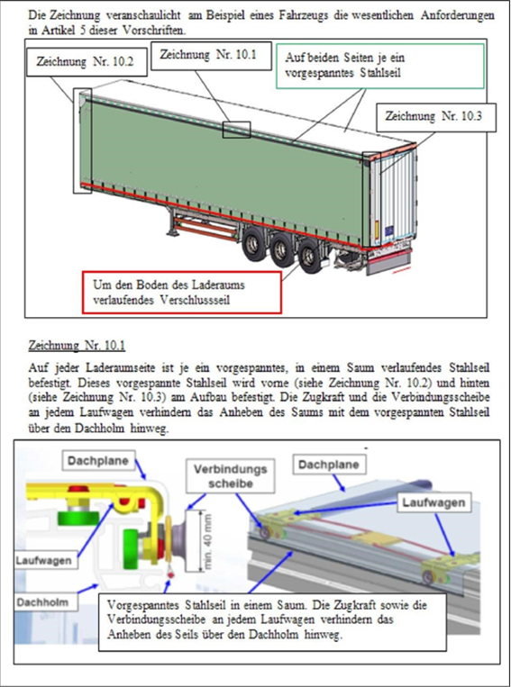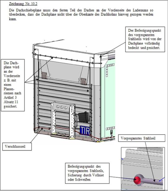 - ii) Das Schiebeplanendach muss den festen Teil des Daches an der Laderaumvorderseite so überdecken, dass die Dachplane nicht über die Oberkante des oberen Trägers gezogen werden kann. An beiden Längsseiten des Laderaums ist in den Saum der Dachplane ein vorgespanntes Stahlseil derart einzuführen, dass es nicht entfernt und wieder eingeführt werden kann, ohne sichtbare Spuren zu hinterlassen. Die Dachplane muss so am Laufapparat gesichert werden, dass sie nicht entfernt und wieder gesichert werden kann, ohne sichtbare Spuren zu hinterlassen.
