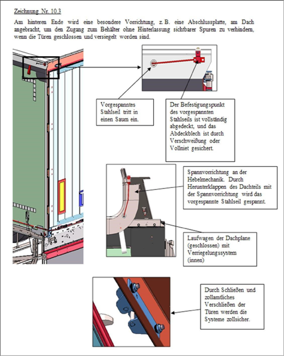 - iii) Die Führung des Schiebeplanendachs, die Schiebeplanenspannvorrichtungen und andere bewegliche Teile müssen so zusammengefügt sein, dass, wenn sie verschlossen und zollamtlich versiegelt sind, Türen, Dächer und andere bewegliche Teile nicht ohne Hinterlassung sichtbarer Spuren von außen geöffnet oder geschlossen werden können. Die Führung des Schiebedachs, die Schiebedachspannvorrichtungen und andere bewegliche Teile müssen so zusammengefügt sein, dass der Zugang zum Laderaum nach Sicherung der Verschlussvorrichtungen ohne Hinterlassung sichtbarer Spuren nicht möglich ist.