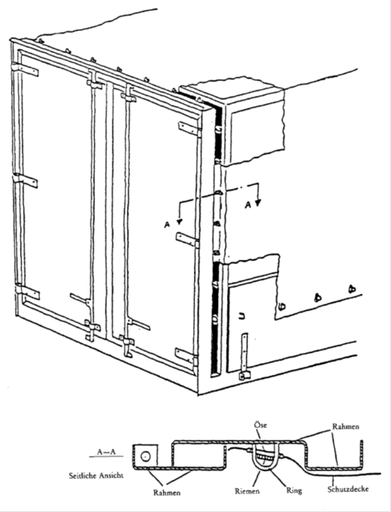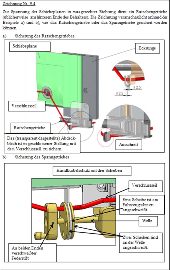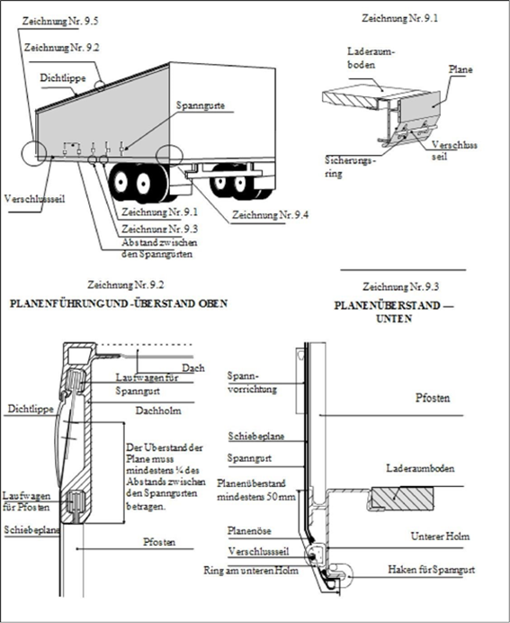 3. iii) Die Führung der Schiebeplane, die Schiebeplanenspannvorrichtungen und andere bewegliche Teile müssen so zusammengefügt sein, dass, wenn sie verschlossen und zollamtlich versiegelt sind, Türen und andere bewegliche Teile nicht ohne Hinterlassung sichtbarer Spuren von außen geöffnet oder geschlossen werden können. Die Führung der Schiebeplane, die Schiebeplanenspannvorrichtungen und andere bewegliche Teile müssen so zusammengefügt sein, dass der Zugang zum Behälter nach Sicherung der Verschlussvorrichtungen ohne Hinterlassung sichtbarer Spuren nicht möglich ist. Ein Beispiel für eine solche Konstruktion ist in der diesen Vorschriften beigefügten Zeichnung Nr. 9 dargestellt.