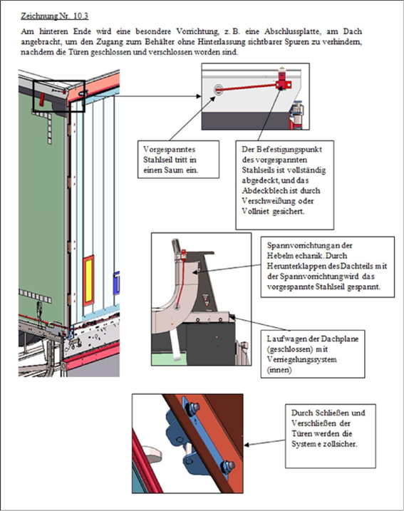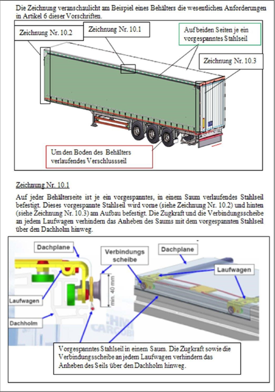 2. ii) Das Schiebeplanendach muss den festen Teil des Daches an der Behältervorderseite so überdecken, dass die Dachplane nicht über die Oberkante des oberen Trägers gezogen werden kann. An beiden Längsseiten des Behälters ist in den Saum der Dachplane ein vorgespanntes Stahlseil derart einzuführen, dass es nicht entfernt und wieder eingeführt werden kann, ohne sichtbare Spuren zu hinterlassen. Das Schiebeplanendach muss so am Laufapparat gesichert werden, dass es nicht entfernt und wieder gesichert werden kann, ohne sichtbare Spuren zu hinterlassen.