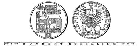 (2) Die andere Seite hat das Bundeswappen, darunter die Zahl „100“ und das Wort „SCHILLING“ sowie die Umschrift „REPUBLIK ÖSTERREICH“ zu tragen.
