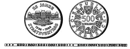 (2) Die andere Seite hat in der Mitte die Zahl „500“, darunter das Wort „Schilling“, ferner in kreisförmiger Reihung das Bundeswappen und die Wappen der neun Bundesländer sowie die Umschrift „Republik Österreich“ zu tragen.