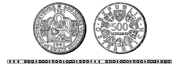 (2) Die andere Seite hat in der Mitte die Zahl „500“, darunter das Wort „Schilling“, ferner in kreisförmiger Reihung das Bundeswappen und die Wappen der neun Bundesländer sowie die Umschrift „Republik Österreich“ zu tragen.