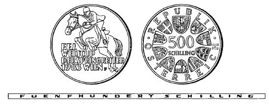 (1) Die eine Seite hat einen Springreiter, der im Begriff ist, eine Hürde zu übersetzen, und die Inschrift „F.E.I. WELTCUP DER SPRINGREITER 1983 WIEN“ zu zeigen.
