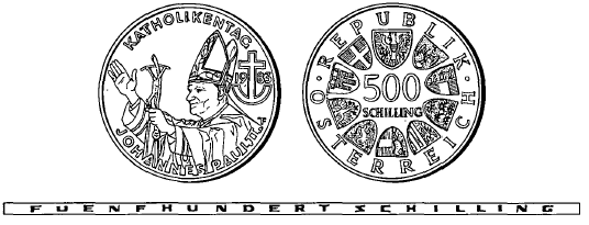 (2) Die andere Seite hat in der Mitte die Zahl „500“, darunter das Wort „SCHILLING“, ferner in kreisförmiger Reihung das Bundeswappen und die Wappen der neun Bundesländer sowie die Umschrift „REPUBLIK ÖSTERREICH“ zu tragen.