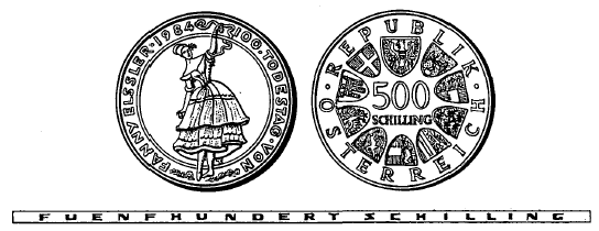 (1) Die eine Seite hat Fanny Elßler in einer Tanzpose, die Jahreszahl „1984“ sowie die Umschrift „100. TODESTAG VON FANNY ELSSLER“ zu zeigen.