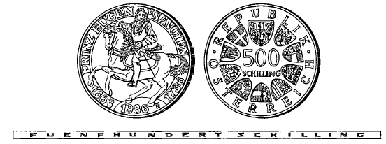 (1) Die eine Seite hat den Prinzen Eugen zu Pferd, die Umschrift „PRINZ EUGEN V. SAVOYEN“ und die Jahreszahlen des Geburtsjahres „1663“, des Todesjahres „1736“ sowie des Emissionsjahres „1986“ zu zeigen.