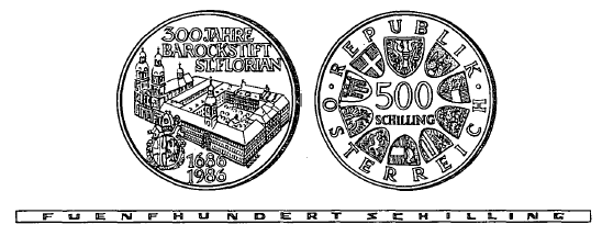 (1) Die eine Seite hat die Ansicht der Stiftsanlage, das Stiftswappen und die Inschrift „300 JAHRE BAROCKSTIFT ST. FLORIAN“ sowie die Jahreszahlen „1686“ und „1986“ zu zeigen.
