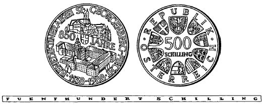 - 1. Die eine Seite hat in der oberen Hälfte die Benediktinerabtei St. Georgenberg, darunter die Zahl „850“, das Stiftswappen und das Wort „JAHRE“, in der unteren Hälfte das Stift Fiecht sowie die Umschrift „BENEDIKTINERABTEI ST. GEORGENBERG-FIECHT“ und die Jahreszahlen „1138-1988“ zu zeigen.
