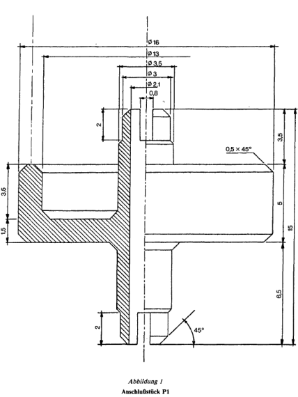 Injektionsspritze zur Gaschromatographie (Abbildung 5) „Precision sampling“, Serie A2 (oder gleichwertige Spritze). Diese Spritze ist an ihrem Nadelende mit einem Verschlußhahn versehen. Die Spritze ist mit der Aufnahmeflasche durch das Anschlußstück P1 und durch ein Polyäthylen-Röhrchen (Länge 8 mm, Durchmesser 2,5 mm) verbunden.