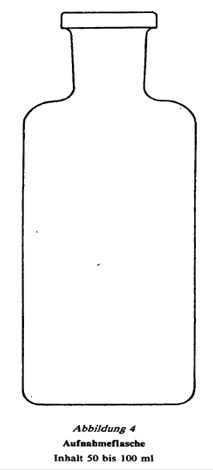 Um eine ausreichende Menge überzuleiten, ist es erforderlich, die Luft aus der Flasche zu verdrängen. Zu diesem Zweck werden mittels des Anschlußstücks P1 ungefähr 10 ml Dichlordifluormethan oder Butan (je nach Art des zu untersuchenden Aerosols) eingefüllt. Dieses läßt man bis zum vollkommenen Verschwinden der flüssigen Phase verdampfen; die Flasche ist dabei mit dem Ventil nach oben zu halten. Das Anschlußstück wird abgetrennt und die Aufnahmeflasche gewogen („a“ Gramm). Die Druckgaspackung, von der eine Probe entnommen werden soll, wird kräftig geschüttelt. Nun wird das Anschlußstück P1 auf das Ventil der Druckgasflasche aufgesetzt (Ventil nach oben), dann die Aufnahmeflasche Pt (Hals nach unten) auf das Anschlußstück P1 angeschlossen und gedrückt. Auf diese Weise wird die Aufnahmeflasche bis zu etwa
