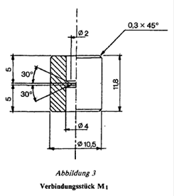 Das Anschlußstück P1 (siehe Abbildung 1) wird aus Duraluminium oder aus Messing angefertigt. Es ist so beschaffen, daß es mittels eines Anschlußstücks aus Polyäthylen an die unterschiedlichen Ventilsysteme paßt (siehe Abbildungen 2 und 3). Die Aufnahmeflasche (siehe Abbildung 4) besteht aus weißem Glas, das außen mit einer durchsichtigen Kunststoffschutzschicht überzogen ist. Der Flascheninhalt beträgt 50 bis 100 ml. Die Flasche ist mit dem Ventil, aber ohne Steigrohr ausgestattet.