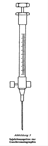 Nach Überleitung einer ausreichenden Menge des Erzeugnisses in die Aufnahmeflasche mittels des Anschlußstücks P1 wird das konische Ende der Spritze, wie unter 5.4.2.2 beschrieben, auf die Aufnahmeflasche aufgesetzt. Bei geöffnetem Verschlußhahn wird eine ausreichende Menge an Flüssigkeit angesaugt; Gasblasen durch wiederholtes Hin- und Herbewegen des Kolbens entfernt (erforderlichenfalls Kühlen der Spritze). Wenn die Spritze eine ausreichende Menge an blasenfreier Flüssigkeit enthält, wird der Verschlußhahn geschlossen und die Spritze von der Aufnahmeflasche gelöst. Nun wird eine Nadel aufgesetzt, die Spritze in das Einlaßsystem der Chromatographen eingeführt, der Verschlußhahn geöffnet und injiziert.