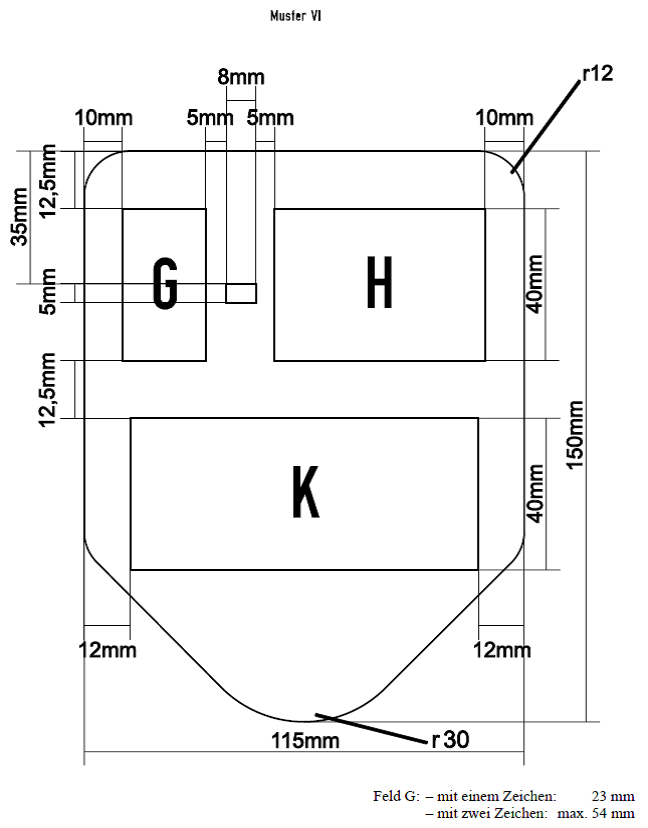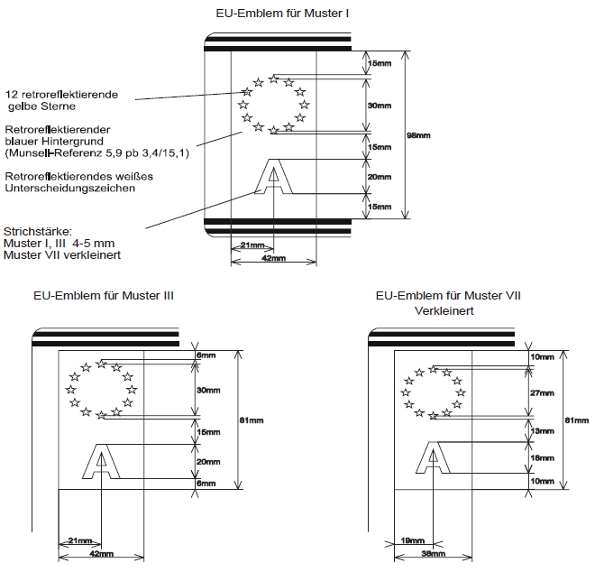 Kennzeichen | EU-Emblem | Grundfarbe | Schriftfarbe | Wappen Anhang A2 | Vormerkzeichen Anzahl=/<siehe § 26 | Muster entsprechend A.1. | |||