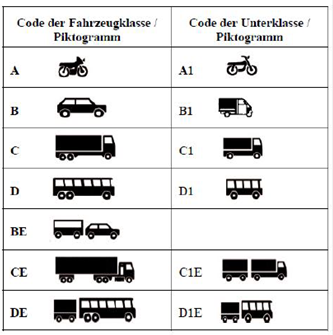 - 8. Der Führerschein kann für die folgenden Fahrzeugklassen ausgestellt werden: