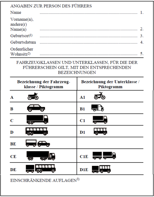 3) Z.B. „Muss Brille tragen“, “Nur gültig für das Führen von Fahrzeug Nr. …“ „Vorbehaltlich der Ausrüstung des Fahrzeuges für das Führen durch einen Beinamputierten“.