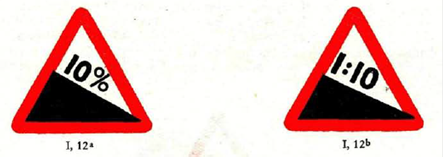 1. Das Zeichen [Signal] „GEFÄHRLICHES GEFÄLLE" (I, 12) wird verwendet, wenn die zuständigen Behörden es für notwendig erachten, vor einem gefährlichen Gefälle zu warnen, sofern die Neigung zehn Prozent übersteigt oder wegen der örtlichen Verhältnisse eine Gefahr darstellt.
