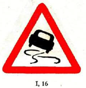 Das Zeichen [Signal] „SCHLEUDERGEFAHR" (I, 16) wird verwendet, wenn die zuständigen Behörden es für notwendig halten, einen Abschnitt der Fahrbahn anzuzeigen, dessen Oberfläche unter bestimmten Verhältnissen glitschig sein kann.