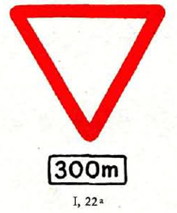 3. Wenn das Zeichen (Signal) I,22 verwendet wird, geht ihm das Zeichen (Signal) I,7 nicht voran, aber es kann ihm ein Zeichen (Signal) vorangehen, das aus einem Zeichen [Signal] I, 22 besteht, dem wie in der Abbildung I, 22a ein rechteckiges Schild mit der Angabe des Abstandes von der Gabelung, Kreuzung oder Einmündung beigefügt ist.