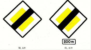 4. Dieses Zeichen [Signal] kann auch verwendet werden, um anzuzeigen, daß man sich dem Ende einer Vorrangstraße nähert. In diesem Fall muß, wie in Abbildung III, A. 9a dargestellt, darunter zusätzlich ein rechteckiges Schild angebracht werden mit dem Hinweis, in welcher Entfernung der Vorrang der Straße aufhört.