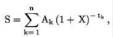e) Mathematisch darstellen lässt sich diese Gleichung durch eine einzige Summation unter Verwendung des Faktors „Ströme“ (Ak), die entweder positiv oder negativ sind, je nachdem, ob sie für Auszahlungen oder für Rückzahlungen innerhalb der Perioden 1 bis n, ausgedrückt in Jahren, stehen: