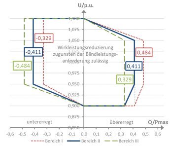 Es gilt grundsätzlich der Blindleistungsbereich II (entspricht bei 1 p.u. einem Leistungsfaktor von 0,925 untererregt bis 0,925 übererregt).